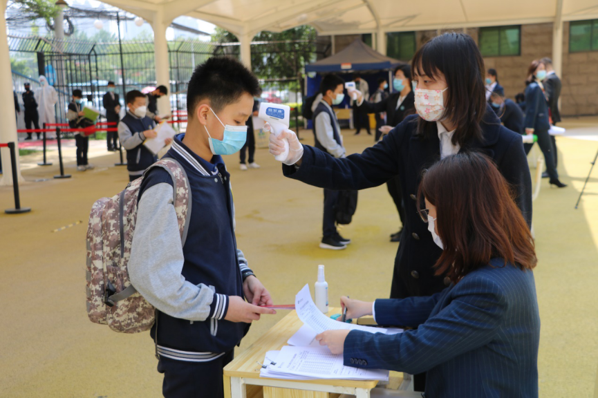 学生统一在学校1、2号门接受体温检测后进入校门,为了不使家长在校门口停留,老师们纷纷走出校门,亲手从家长手中接过学生们的行李,让家长安心地目送孩子进入校园。