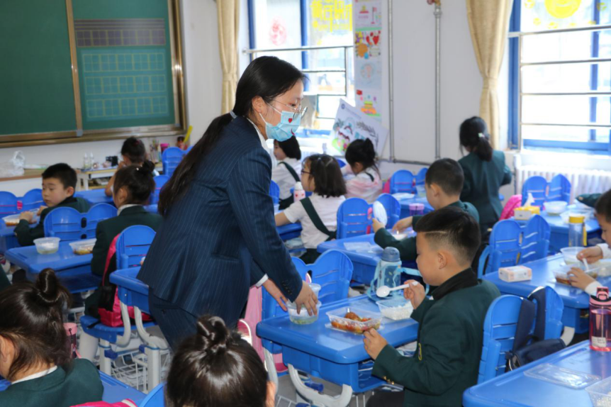 为了减少交叉感染的纪律,小学部的午餐在教室进行,老师为小朋友发放午餐。