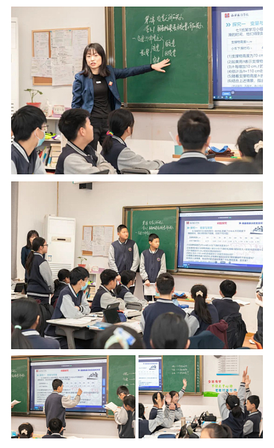 七年级杨雅捷老师执教的《用表格表示变量之间的关系》,作为本章的开章课,杨老师先让学生简单的了解初中数学的教学体系,给学生心中播下“函数”的种子,然后用视频及课前小实验激发学生的求知欲,进入自主学习状态;采用小组合作的方式突破难点。整节课如行云流水,课堂氛围轻松愉悦,乐在其中。