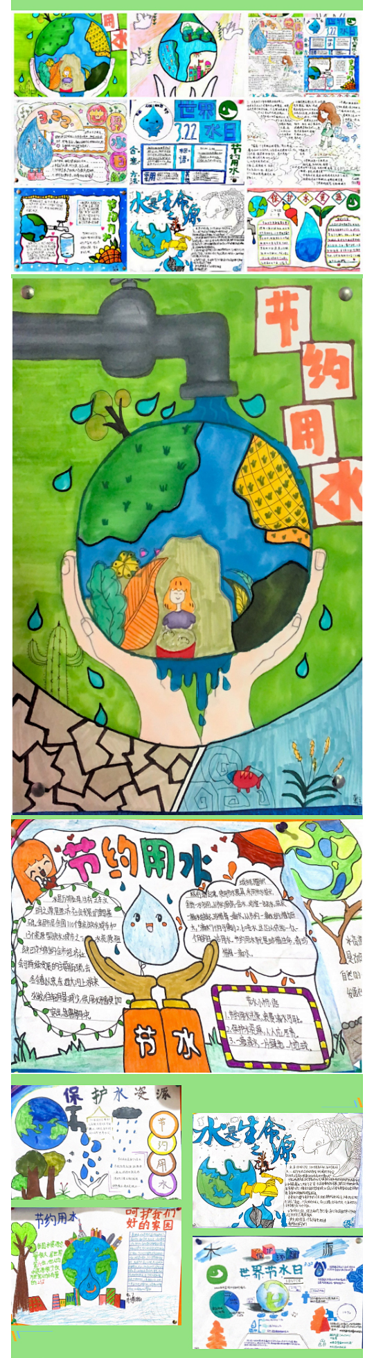 2022年3月22日是第十三届“世界水日”,为增强藤信学子“节水、爱水、护水”的环保意识和社会责任感,更好地树立热爱生活、热爱环境、敢于创造、健康向上的精神风貌,西安北大新世纪学校七年级地理备课组组织开展了“惜水、节水、爱水,从我做起”、“保护水资源,生命真永远”主题手抄报活动,倡导大家珍惜水、节约水、保护水。