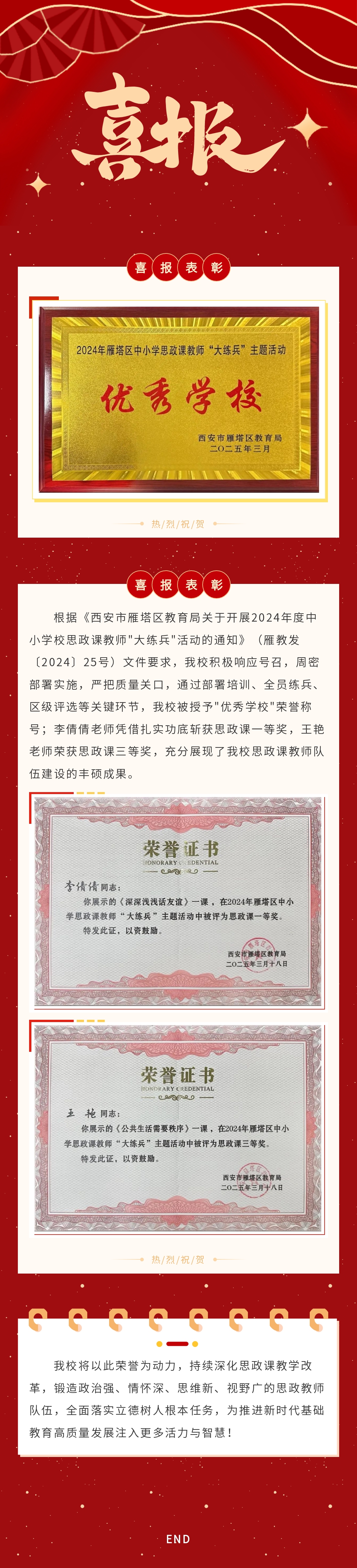 思政课教师展风采 大练兵活动结硕果——我校在2024年雁塔区中小学思政课教师“大练兵”主题活动中喜获佳绩