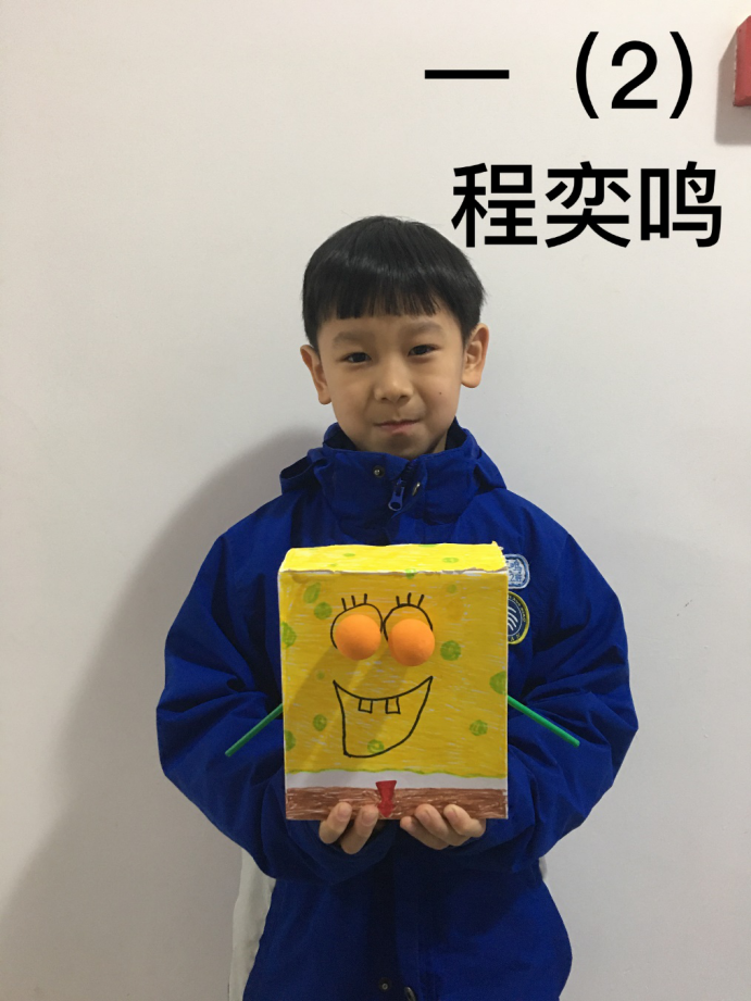 这是动画片《海绵宝宝》的主人公一一海绵宝宝。这是我和妈妈一起制作完成的,海绵宝宝胖胖的身体是个长方体,细细的胳膊是圆柱,大大的眼睛是球。妈妈希望我和海绵宝宝一样天真活泼,积极阳光,做一个乐天派,帮助别人。我很喜欢海绵宝宝。