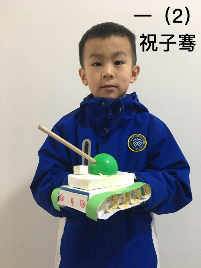 因为我特别喜欢坦克,所以爸爸和我一起利用一些生活中的立体图形制作了这辆坦克,谢谢爸爸送我的这个礼物。