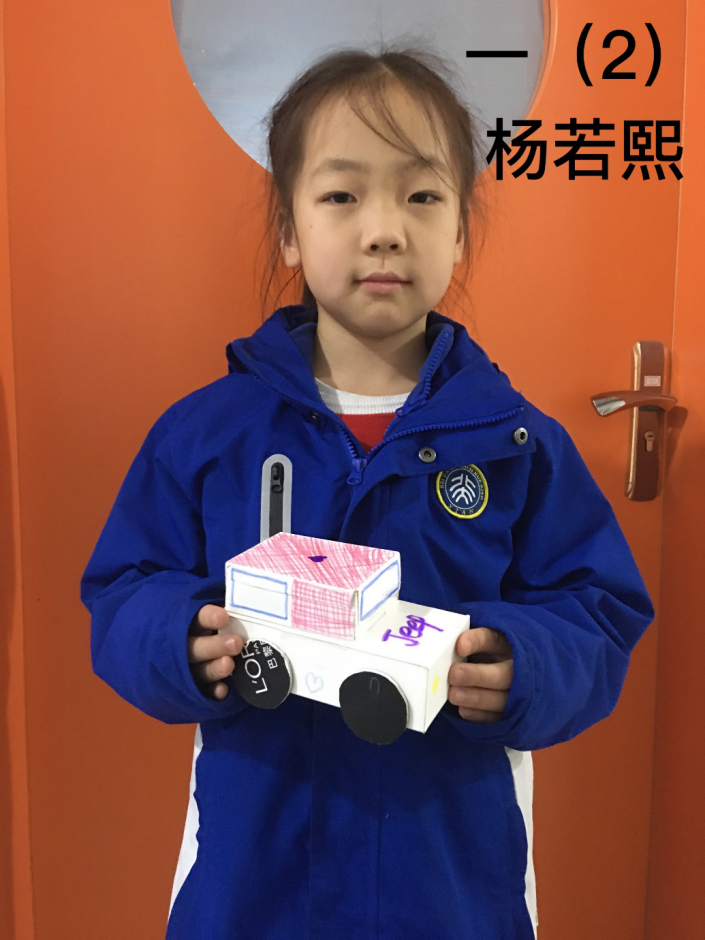这是我和姑姑一起制作的吉普车,用到了长方体,正方体,圆柱。车身是长方体和正方体的拼接,纸板裁剪后做成汽车的轮子,采用纸板表面装饰汽车,你们是不是也觉得它很漂亮啊?