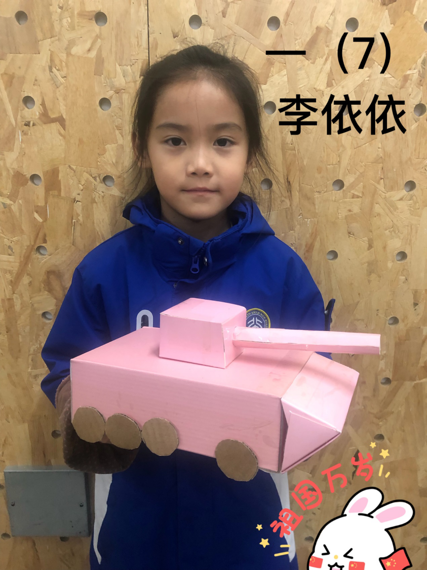 我的作品叫99A式主战坦克,它有2个长方体,5个圆柱。和赵老师学了立体图形后,我找了空盒子、筷子、彩纸,告诉妈妈我要的样子,妈妈帮助我一起完成的。它是在今年国庆阅兵上展示过的呢!