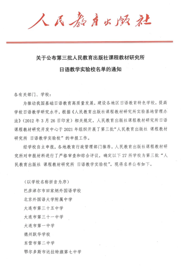 2022年1月15日,西安北大新世纪学校成功入选第三批“人民教育出版社课程教材研究所日语教学实验校”。本次入选学校全国共有27所,西安北大新世纪学校的入选,充分肯定了我校开设日语教学班以来,在日语学科建设和教材研究等方面所做出的努力,是西安北大新世纪学校日语学科发展中的一座里程碑,标志着我校日语教学取得重大突破,也标志着我校特色办学迈向了一个新阶段,为提升学校日语教学水平,进一步培养外语突出、全面发展的高素质人才创造了条件。